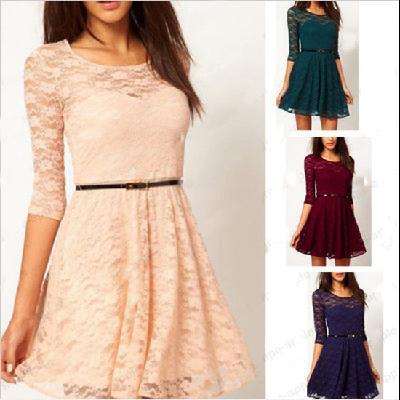 Womens Sexy All Lace 3/4 Sleeve Spoon Neck Belted Dress