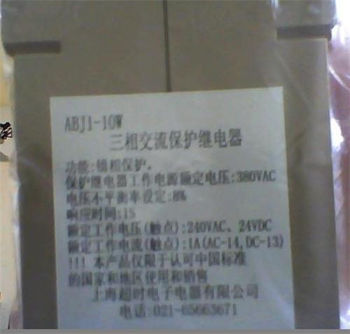 ABJ1-122 is my factory developed the production with load protection three-phase protection relays A; B; C function: dynamic off-phase; static phase; voltage imbalance; wrong phase power supply rated voltage protection: 380VAC voltage unbalance rate setting: 8% Response Time: 2S form of electric shock: 2C rated working voltage (contact): 240VAC, 24VDC rated current (contact): 1A (AC-14, DC-13)