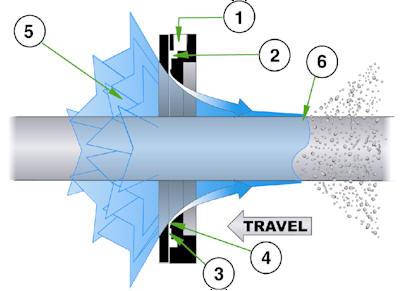 Compressed air through the air circulation through the inlet (1) into the ring cavity (2). Then the throttle and speed through the annular nozzle (3) a stream