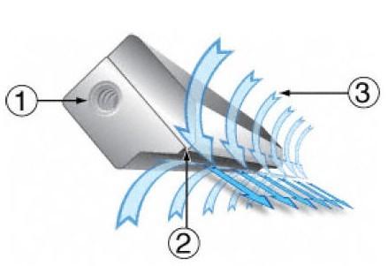 Compressed air through the air inlet (1) into the air knife hyperbaric chamber; airflow through narrow; thin nozzle (2) in the longitudinal direction of the air knife to form a