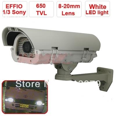 Sony CCD Effio, 650 TVL, Deluxe full aluminum alloy oxidation, car plate capture, strong light inhibition, 8-20mm lens, 30m distance, color photo taking in the evening, 5 modes choices (manual) , 90 LED, unique double glass design at the front, thunderproof design, Glare inhibition function.