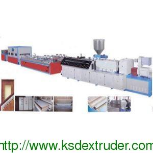 Production processing: Mixing – double screw extruder -die- vacuum sizing - cooling - adjustment-hauling off-cutting-unloading-membrane addition. The production line is stable, highly productive and durable. And Its main electrical devices are imported from foreign parts. The finished product is 500-1000 mm width and 20-40 thickness. With further membrane addition, the products are good-looking and elegant as an ideal decoration material.