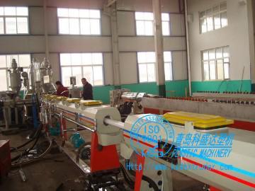 SJ90/65 three-PPR pipe extrusion line adopts three-layer co-extruded composite mould with dedicated spiral to extruder directly though the inner and outer layers. The mold with a spiral flowing channel can enhance effect of the intermediate layer of reinforcing fibers arranged according to a certain helix angle. To produce such pipes can also do some modification in the existing pure PP-R pipe production line. SJ90/65 three-layer PPR pipe extrusion machine includes SJ90/65 high-speed extruder, automatic drying feeder, color line extruder, PP-R co-extruded composite mold, the vacuum sizing spray cooling water tank, the tractor , printing machine, cutting machine, turning pipe rack.