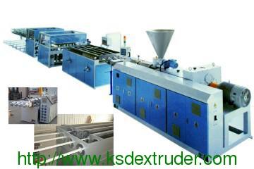 PVC four-pipe production line adopts the conical twin-screw extruder, equipped with four-pipe extrusion mold. Auxiliary machine configuration: a four-type vacuum stereotypes, a four-crawler tractor, a four type chipless cutting machine. PVC four-pipe extrusion machine has not only lower cost, but also improves the production capacity.