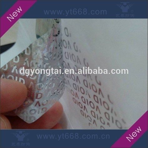 1,Special technology is used to make a type of matrix on the reverse side of the material. (Commonly, the matrix goes 'VOID','OPENED',or special version specified by the customers. ) When the sticker is tore up from the surface of the object, the preestablish matrix or pattern will stay on the surface of the object perfectly. And the sticker can not be recovered any more. It plays an important role in warning. It is used to distinguish the phenomenon that the products are to be opened without authorization and illegally. It can also help to protect the trademark of the application products effectively.