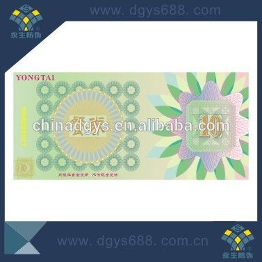 | Feature: | special paper, watermark paper, security paper, PET, etc. | Custom Order: | Accept | Place of Origin: | Guangdong, China (Mainland) |