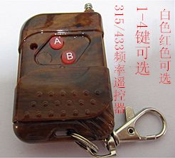 | Technical Parameters: 1. Working voltage : 12V (23A battery ) ; 2. Operating Current : ≤9mA; 3. The oscillation mode : SAW resonator ; 4. Modulation : ASK; 5. Operating frequency : 315MHz, 433.92MHz, special frequency can be customized ; 6. Frequency deviation : ± 150kHz (max); 7. transmit power : 10mW; 8. encoding format : PT2262, EV1527, HCS301 ( rolling code ) and other Dimensions : 58 * 39 * 14mm Color: Red cherry wood, mahogany gold, elegant white, pearl white, blue, black, jade Keys: 1-4 key Optional Purpose: remote control electric doors, windows, switches, security and other remote areas |