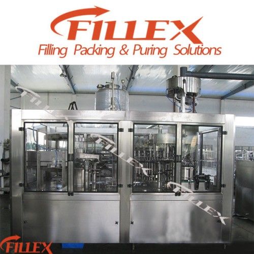 Then bottle is transferred to filling machine through poking bottle star-wheel. The bottle is hold by neck holding plate after it is in the filling machine. The filling valve ascends and descends by the action of cam. It applies pressure filling method. When filling valve descends and touches bottle jack, it opens and finishes the filling course, when finished, the filling valve ascends and leaves the bottle while the bottle is transferred into capping machine through transition star-wheel that clamps bottle neck.