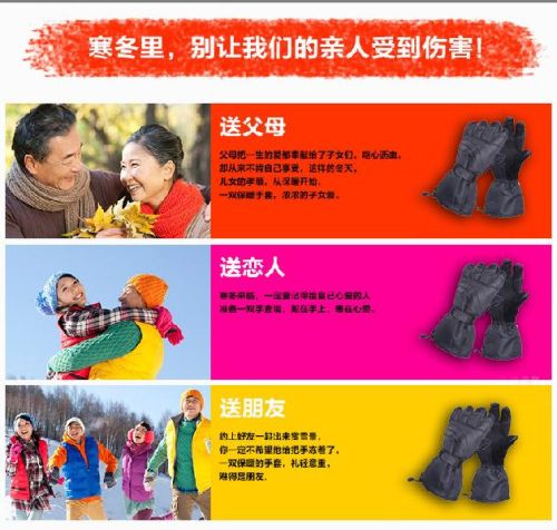'Kngrise'heating warm gloves consist of heating glove, lithium battery and two line output charger. The temperature can be adjusted according to different region and requirements. After connect the electricity, the gloves can supply the heat for thumb, index finger, middle finger, ring finger, little finger and the back of hand. It can be arbitrarily bended without any harms for heating. The product can promote the blood circulation, relieve finger stiffness, pain, numbness due to cold, which provide infinite warmness and care in winter. Usually using heating gloves can supplement the hands energy, accelerating the blood circulation, prevent chilblain in cold season.