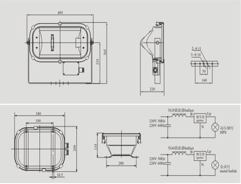 | TG5 | 110v/ 60hz 220v/ 50hz 220v/ 60hz | 250W | 26000 | High-pressure Sodium lamp | E40 | Ø10- ø12 | Ballast-box | IP67 | 8Kg |