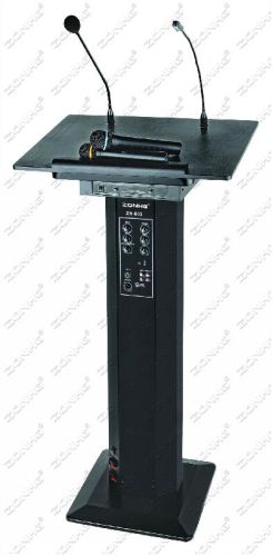 Luxury lectern cabinet is made of aluminummagnesium material, beautiful and nice. built - in active frets with three 6.5-inch woofer, one import tweeter, one gooseneck condenser microphone and twowireless dynamic microphones and an LED lighting small table lamp, suitable forbroadcast speech, full sound quality, amplification characteristics of restoringthe truth to the human voice and music. Has a wide frequency response range anda high degree of sensitivity, widely used in multimedia teaching, hotel, unitsmall meeting rooms and other places.