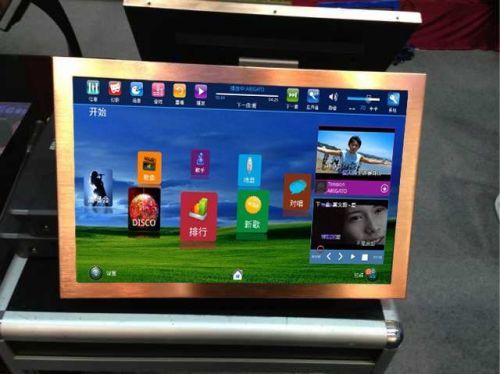 This is a very good quality professional Karaoke player touch screen jukebox system. It's color is rose-gold. metal out frame, stable performance . KTV Karaoke player touch screen made in China.