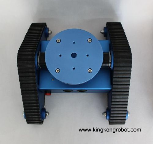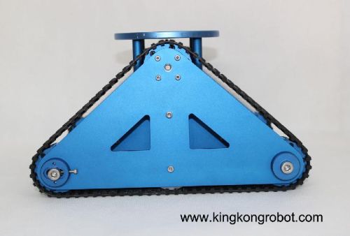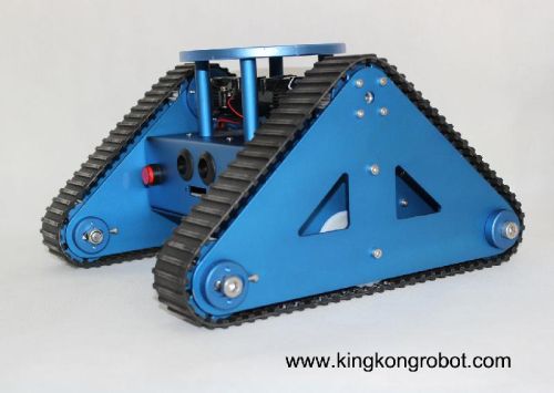 This RC (Remote Control) Tri-Tracked Tank Robot Kit is available as a completed robot kits with a joystick and enable any beginner easily control the robot at his pleases, such as go forward, turn left, turn right, etc. This kit has an aluminum chassis which it is surface was anodized to blue color. Included a robust aluminum chassis with track tank wheel, rubber tracks, microcontroller, and DC motors. Additional, it especially designed a circular plate on the top with some pre-drilled holes for expansion, such as cameras or a micro robot arm, etc.