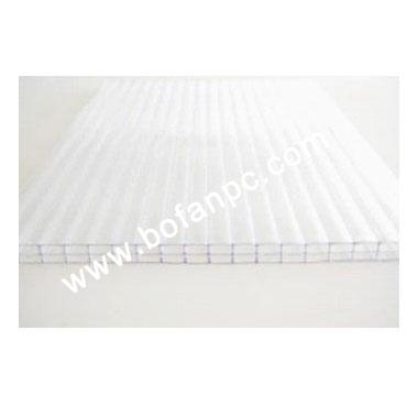 add to cart| Triple-wall hollow polycarbonate sheet 1) Thickness: 8mm, 10mm, 12mm, 14mm, 16mm, 18mm. 2) Max. width: : 2100mm, length up to requests. 3) Color: Clear, Blue, Lake-blue, Green, Brown, Grey, Opal-white, silver, etc PC sheet characteristics: Light weight & High impact strength; Fire resistant; Good Light transmission; With UV protection and thermal insulation; Excellent physical, mechanical, and electrical properties; Inhibits condensation Polycarbonate Usage: subway exits, parking lots, bus-stops, shopping arcades, large stadium and rain tents, green-house, swimming covering, roof light or canopy for office buildings, department store, hotels, schools, amusement cents, hospital, etc. sound absorption wall for freeways, high speed railways http: //www.bofanpanel.com/ |