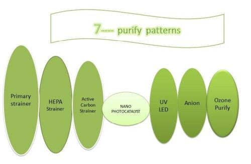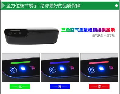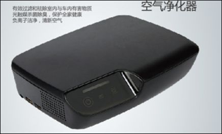 Early efficiency filters, HEPA, activated carbon and efficient, nano-photocatalyst, UVLED, anion, USB charging, oxygen, air quality display, use HEPA, photocatalyst, efficient activated carbon, electrostatic precipitators, negative ions, ozone and other technology integration, killing viruses and bacteria, smoke and dust, eliminate odor purify air inside the car; use odor sensor detects and uses the light guide bar shows the quality of the air purifier .
