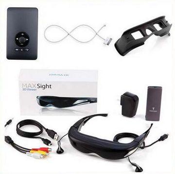 Display: Two TFT LCD display chips . Viewing Size: 80' virtual screen (at 2.5m distance) . Resolution: 640X480 (VGA) . Color Depth: 24-bit input . Viewing Angle (FOV) : 32 diagonal . Video Signal: NTSC/ PAL/ SECAM automatic selection . Audio: Double-channel stereo . Connect with PC: High speed USB2.0 (FS) flash disk . Storage Capacity: Flash memorizer : 4GB, extendable to 32GB TF card . Battery: 1800mAH, 4 hours for video playing . Video Format: RM, RMVB, AVI, FLV, MP4, DAT, VOB, MPG . Music Format: MP3, WMA, APE, AAC, OGG, RA, MIDI, AMR, FLAC . Image Format: JPEG, GIF, BMP . Multi Languages: Simplified Chinese, Traditional Chinese, English . System: Windows2000/ XP/ vista . AC Adapter: Input: AC 100-240V 50/60Hz; Output: DC 5V 1000mA |