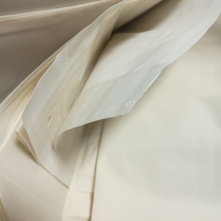 This beige shower curtain is made of waterrepellent PEVA and has 12 button holes for easy hanging.