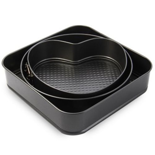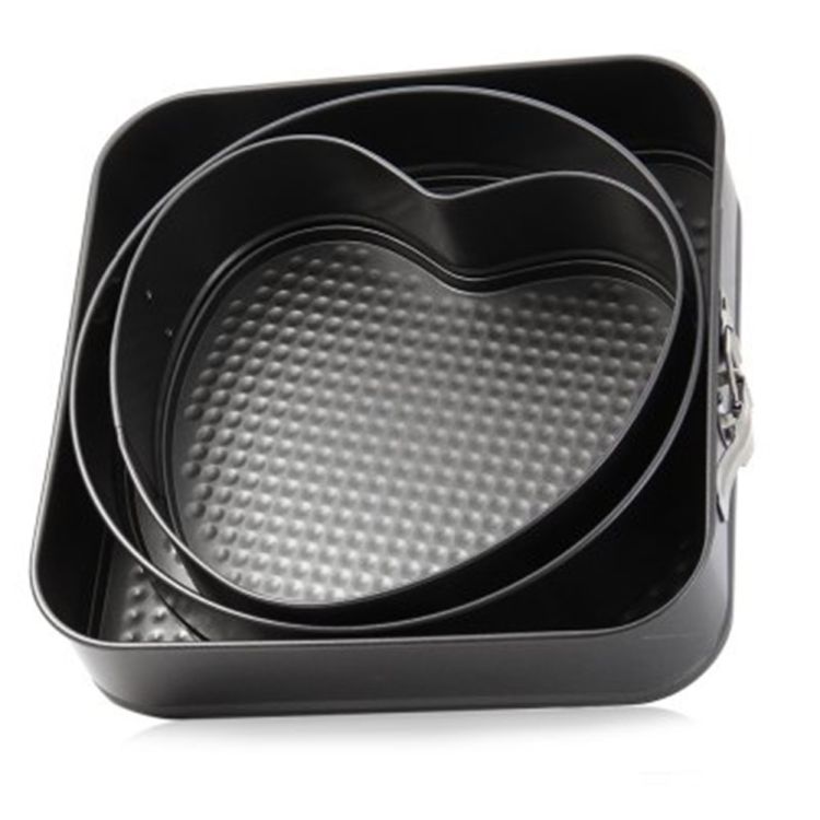 Three springform pans of different shapes in one set, include round shape, heart shape and square shape.