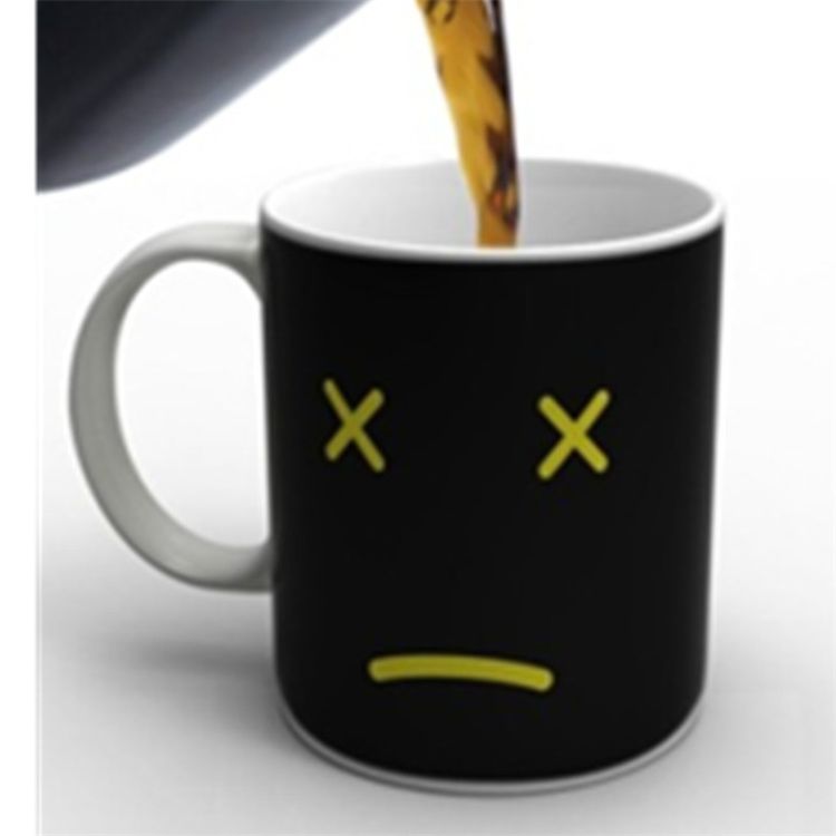 This Magic Morning Cup' s faces changes as soon as heat is applied. Watch as your cup goes from dark and sleepy to yellow and awake and happy!