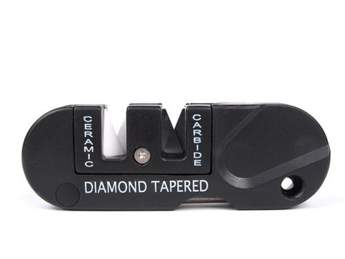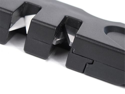 Specialy shaped ceramic slot to finish edges and sharpen serrated blades.