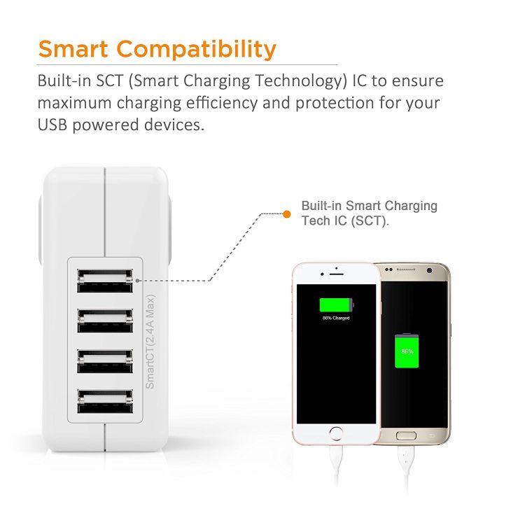 Full-Speed Charging travel adaptor: 4 Ports (4×2.4A) could max up to a 40W/8A output, full-speed charging up to four devices at the same time and automatically adapting the output for each one accordingly