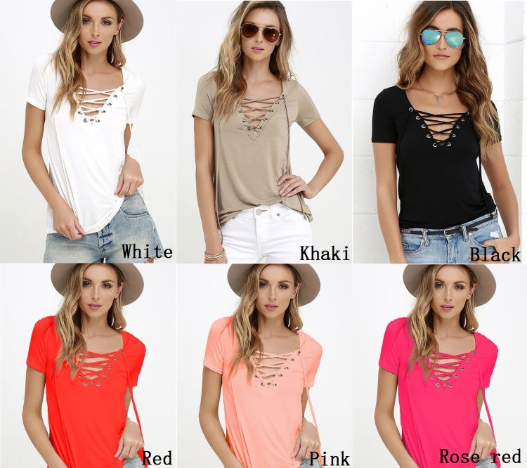 Summer Fashion Lace Up T Shirt Women Sexy V Neck Hollow Out Top Casual Basic Female Plus Size