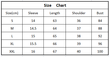 XXL:Shoulder 40cm, Bust 100cm, Sleeve 16cm, Length 67cm