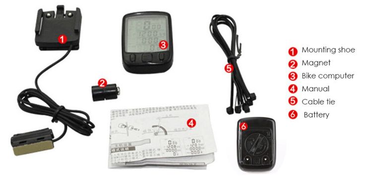 Package Contents: 1 x SunDing SD - 563A Bike Computer, 1 x Cable Tie, 1 x Magnetic Head, 1 x Base with Sensor, 1 x English User Manual