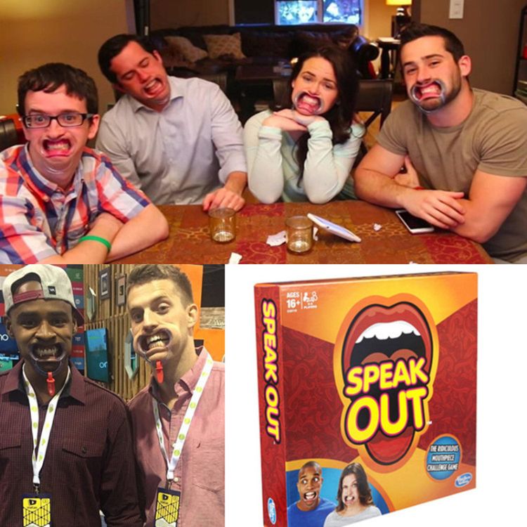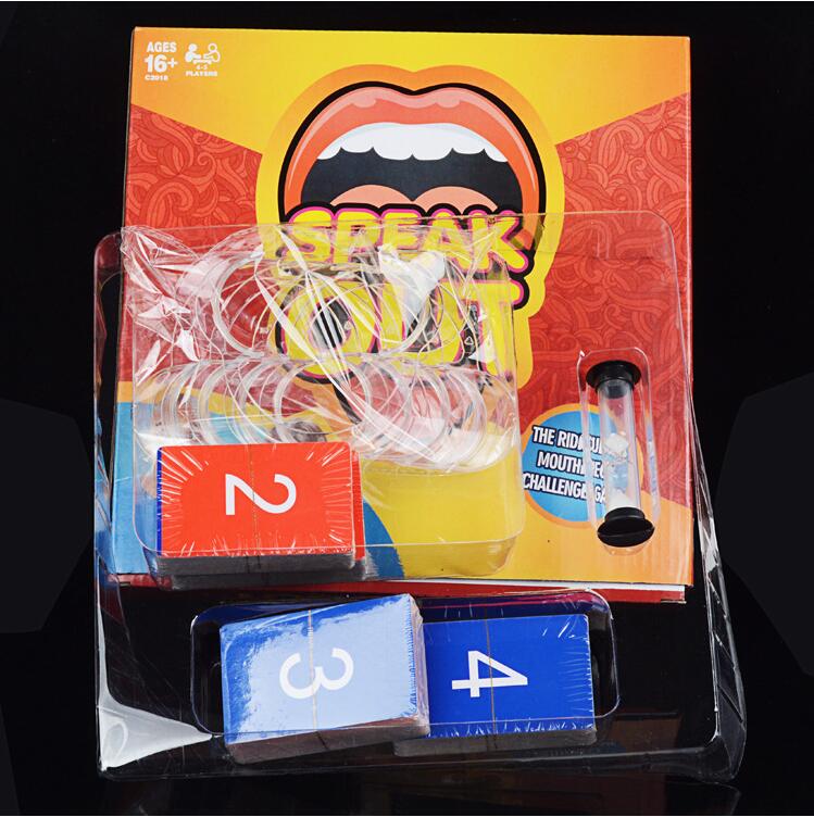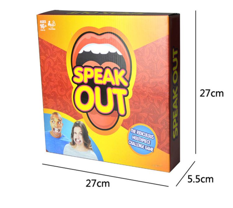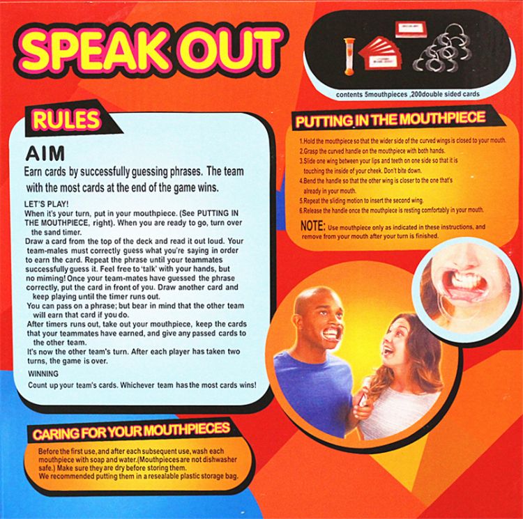 Get ready to be doubled over with laughter with this ridiculous mouthpiece challenge game! The Speak Out game brings friends and family together for laugh-out-loud fun as players try to say different phrases while wearing a mouthpiece that won't let them shut their mouth. In the Speak Out game, players draw from the deck and read the phrase as best as they can, but it's not so easy to do when the mouthpiece is hindering them from forming words correctly. The timer counts down and the laughter begins as players try to decipher what in the world their teammate is trying to say, and must correctly guess the phrase in order to earn the card. The team with the most cards at the end of the game wins.ame wins.