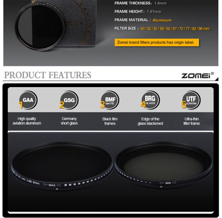Caliber: 49mm; 52mm; 55mm; 58mm; 62mm; 67mm; 72mm; 77mm; 82mm