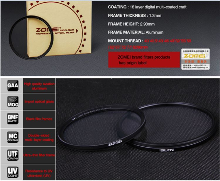 Caliber: 40.5mm; 49mm; 52mm; 55mm; 58mm; 62mm; 67mm; 72mm; 77mm; 82mm