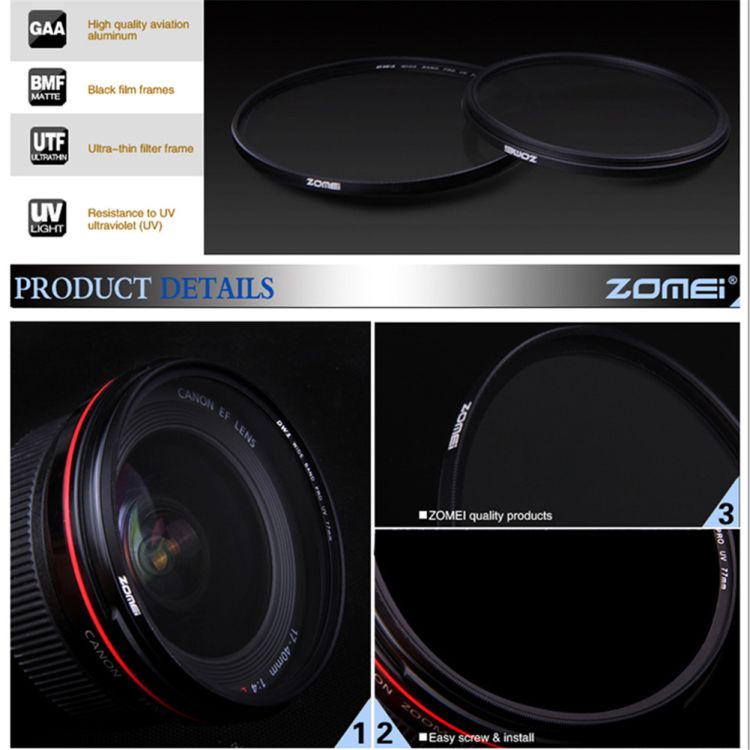 Caliber: 40.5mm; 49mm; 52mm; 55mm; 58mm; 62mm; 67mm; 72mm; 77mm; 82mm