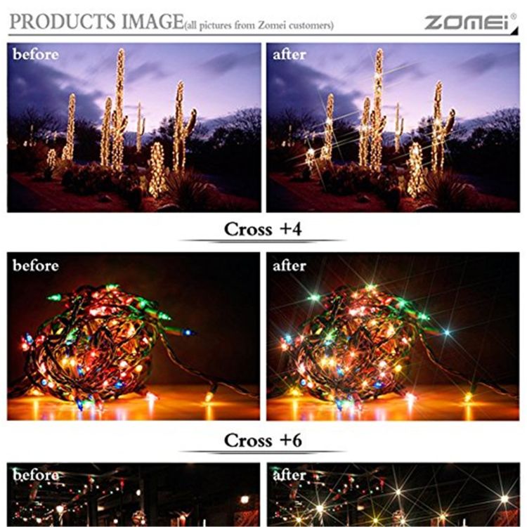 ZOMEI point star cross screen light filter for Digital Camera Lens creates points of light, like 'stars,' streaking outward from a central light source. This can make lighting within the scene take on a more glittering, glamorous appearance.
