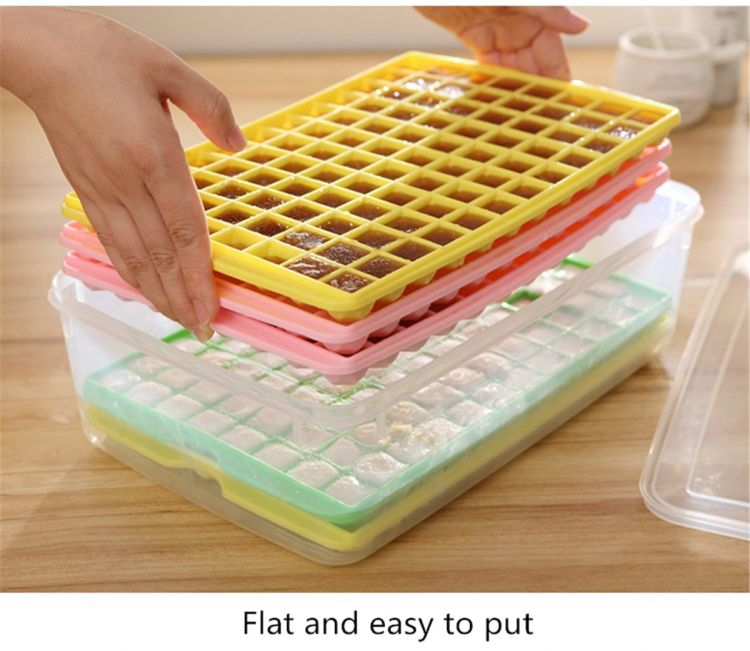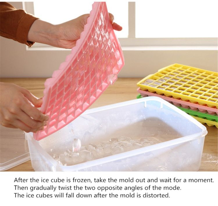 After the ice cube is frozen, take the mold out and wait for a moment. Then gradually twist the two opposite angles of the mode. The ice cubes will fall down after the mold is distorted.