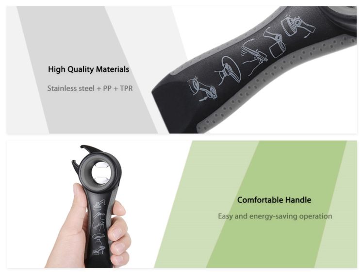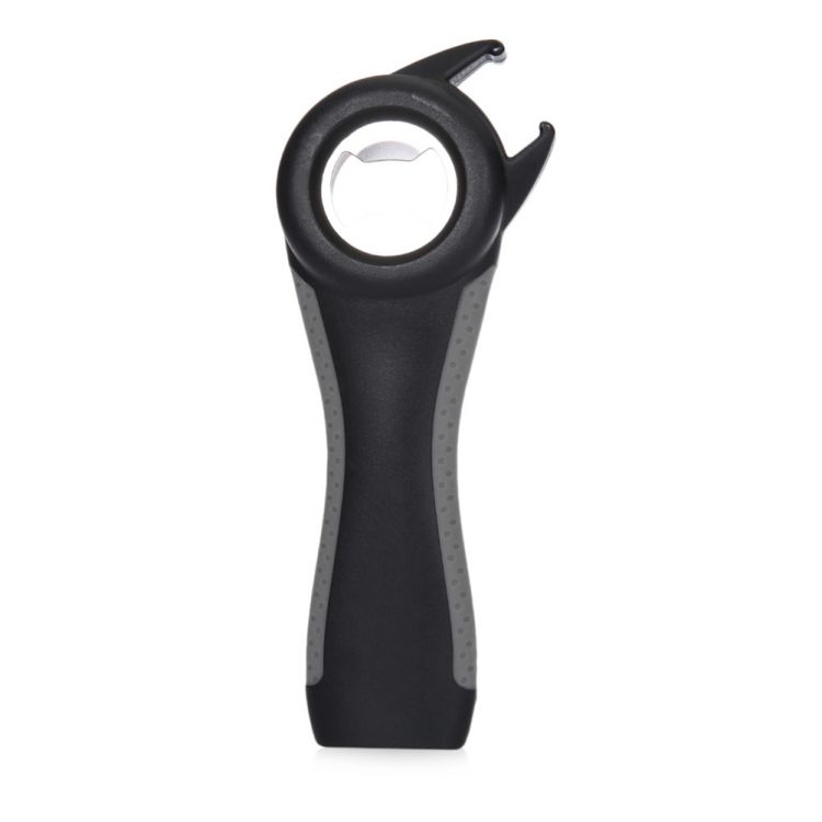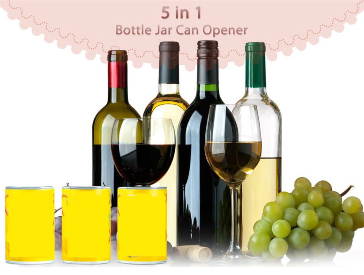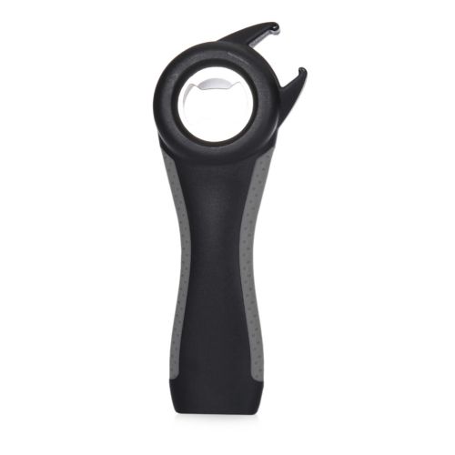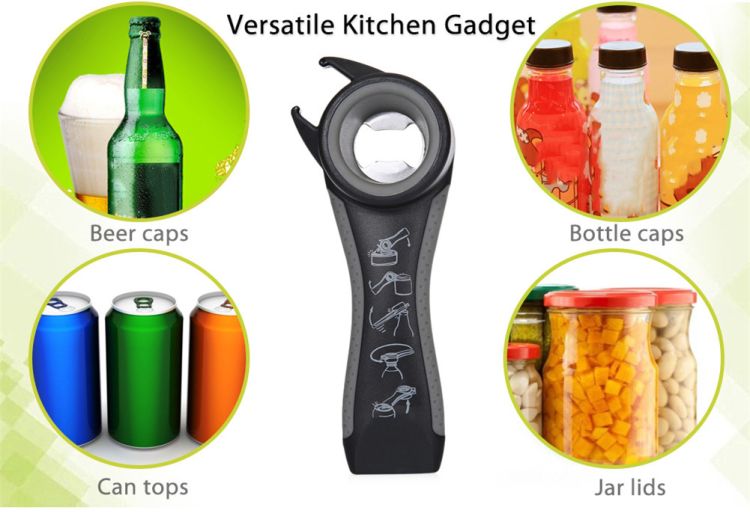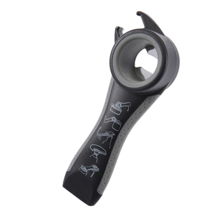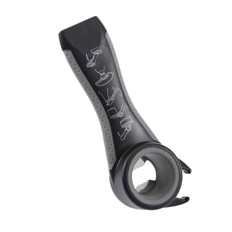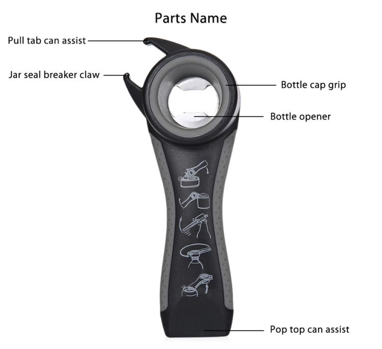 This bottle, or jar, or can opener has five functions: pull tab can assist, jar seal breaker claw, bottle cap grip, bottle opener, and pop top can assist. Its versatility helps you easily open a bottle or can without hurting your hands.