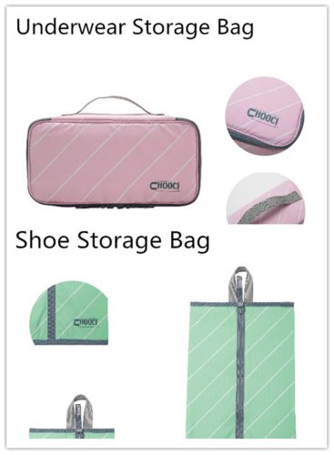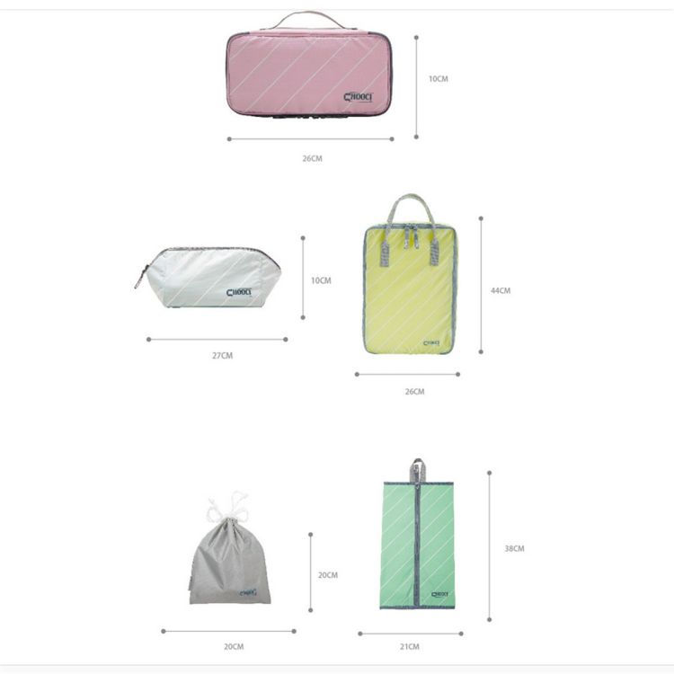 Size: Shoe Storage Bag(8.27'*14.96'); Clothes Storage Bag(10.24'*17.32'); Wash Bag(10.63'*3.94'); Underwear Storage Bag(10.24'*3.94'); Drawstring Storage Bag(7.87'*7.87')