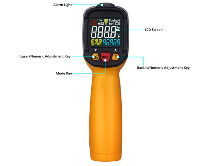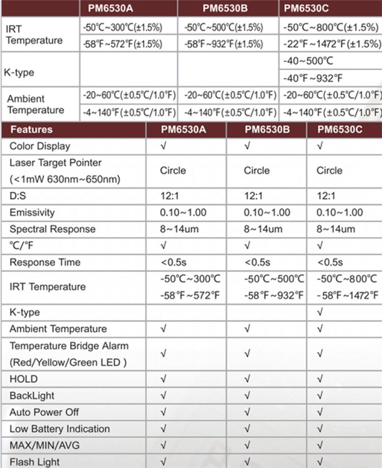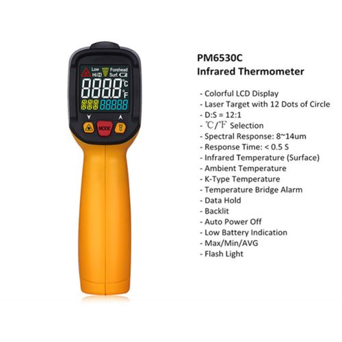 PM6530 series are colorful display and non-contact infrared thermometer that allows you to measure the temperature of the objects by detecting their infrared energy. Multipurpose for cooking, refrigeration, automotive, air conditioning, HVAC and other households.