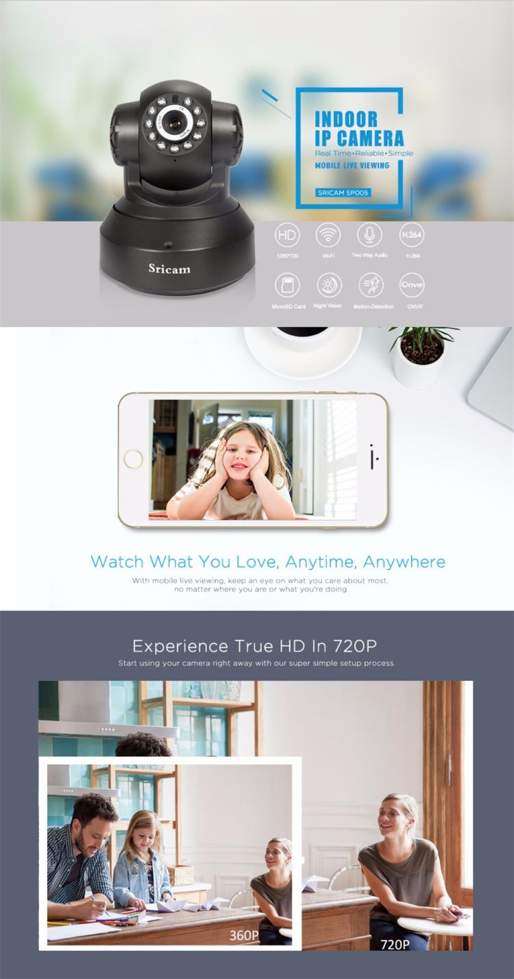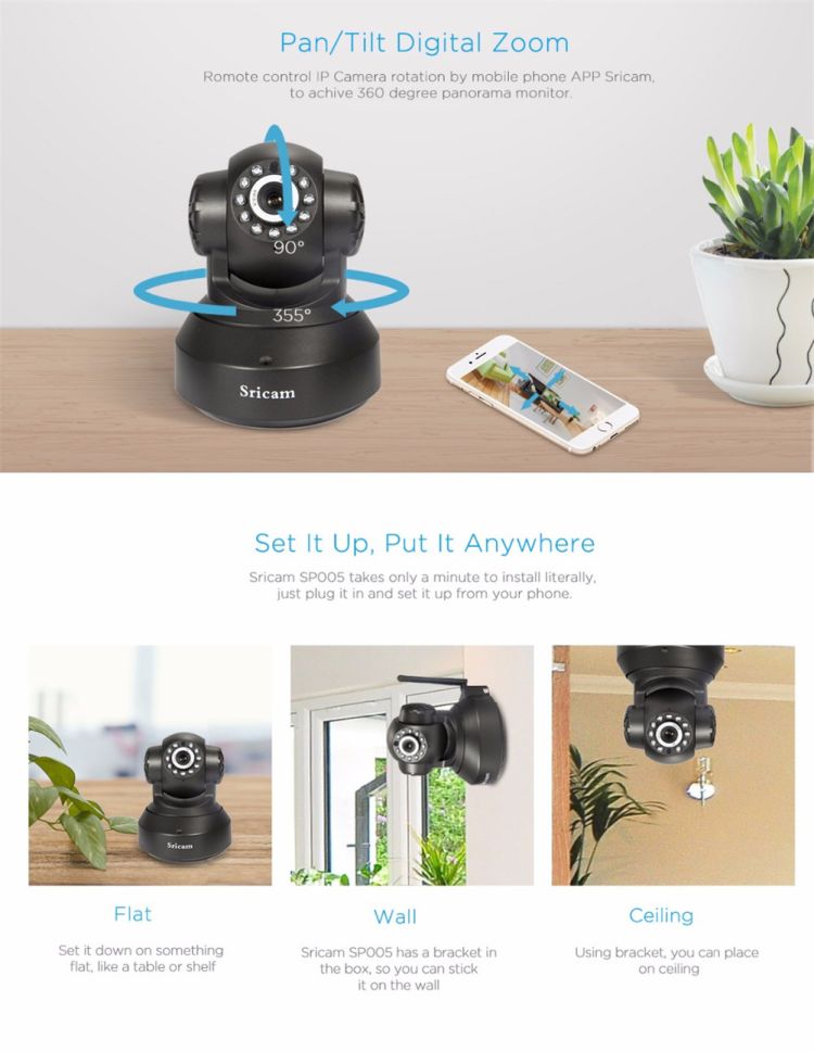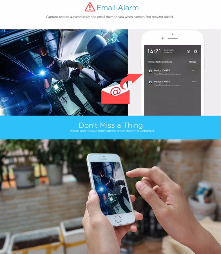 Alarm: Support motion detection alarm, phone push alarm, whistle alarm.
