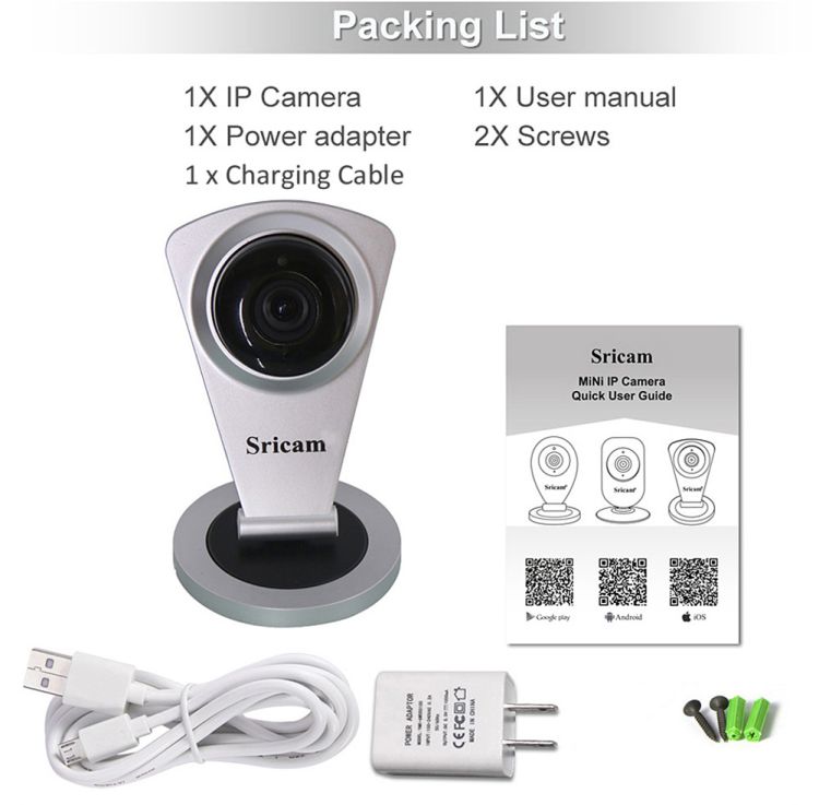 1 x 720P Wireless IP Camera, 1 x Power Adapter, 1 x USB Cable, 1 x English User Manual, 2 x Mounting Screw