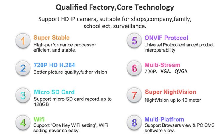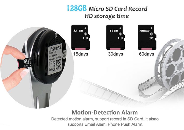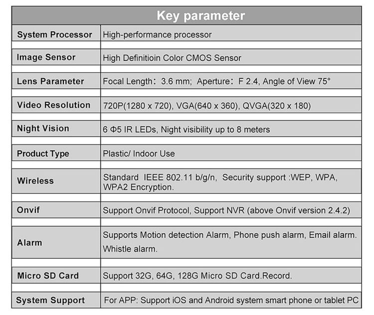 IP camera performance: Interphone,Motion Detection,Night Vision,Real-time video capture and recording,Screenshot,Support video control