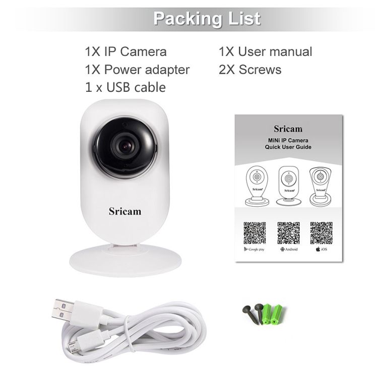 1 x 720P Wireless IP Camera, 1 x Power Adapter, 1 x USB Cable, 1 x English User Manual, 2 x Mounting Screw