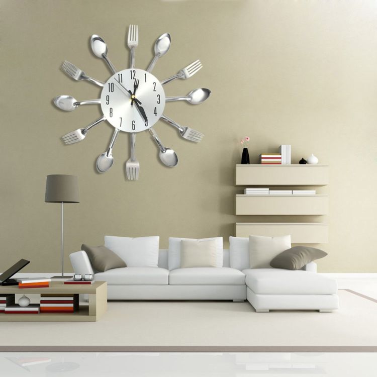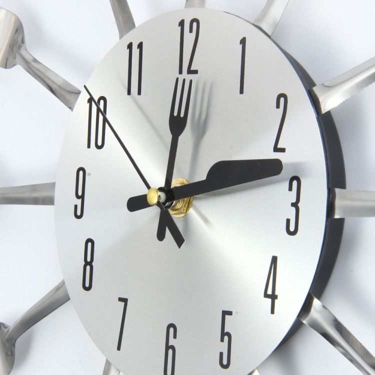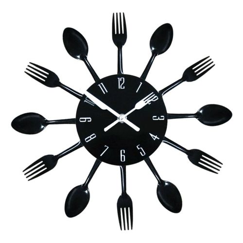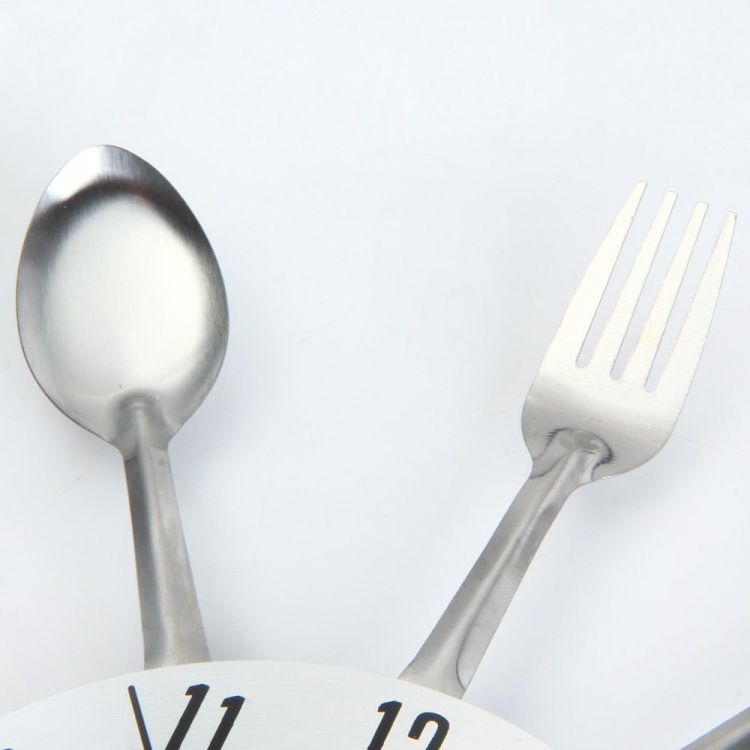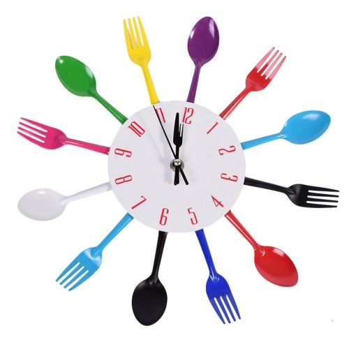 This is a funny and creative modern cutlery wall clock. With spoon or fork beside each number, the hour pointer is designed like a super mini fork and the minute pointer like a mini knife.