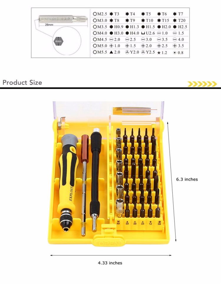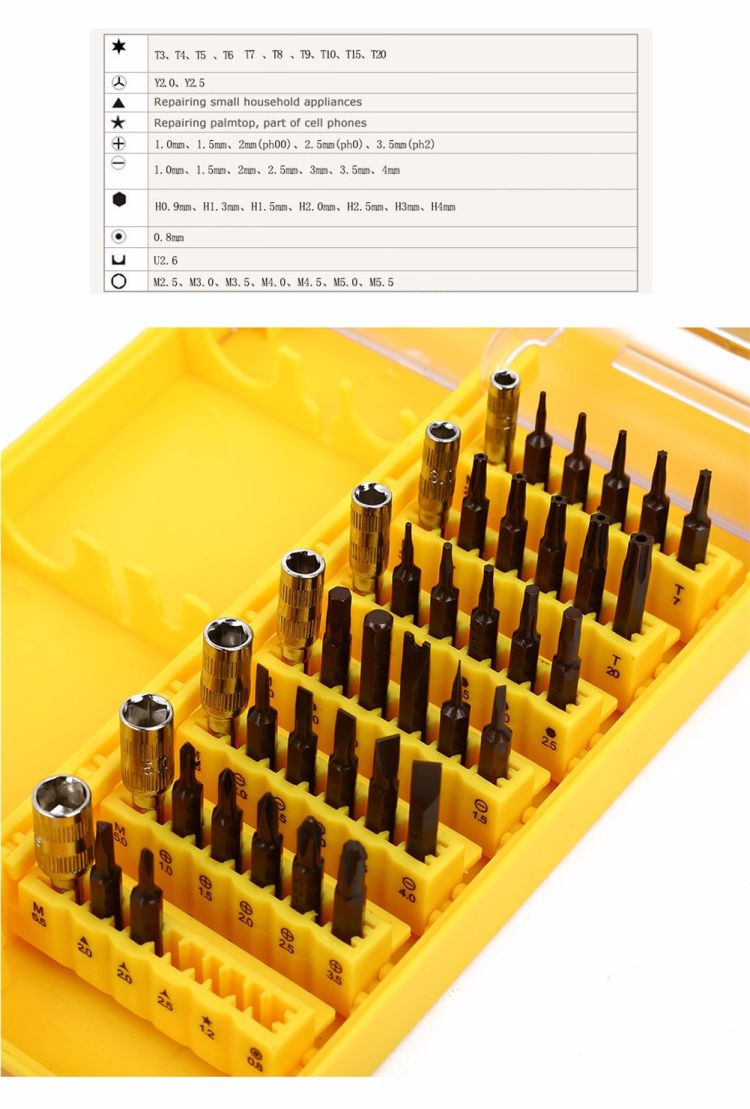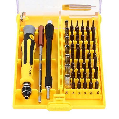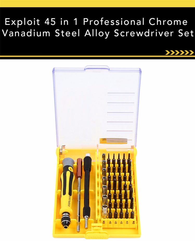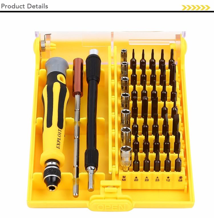 - 45 in 1 interchangeable precise tool set.
