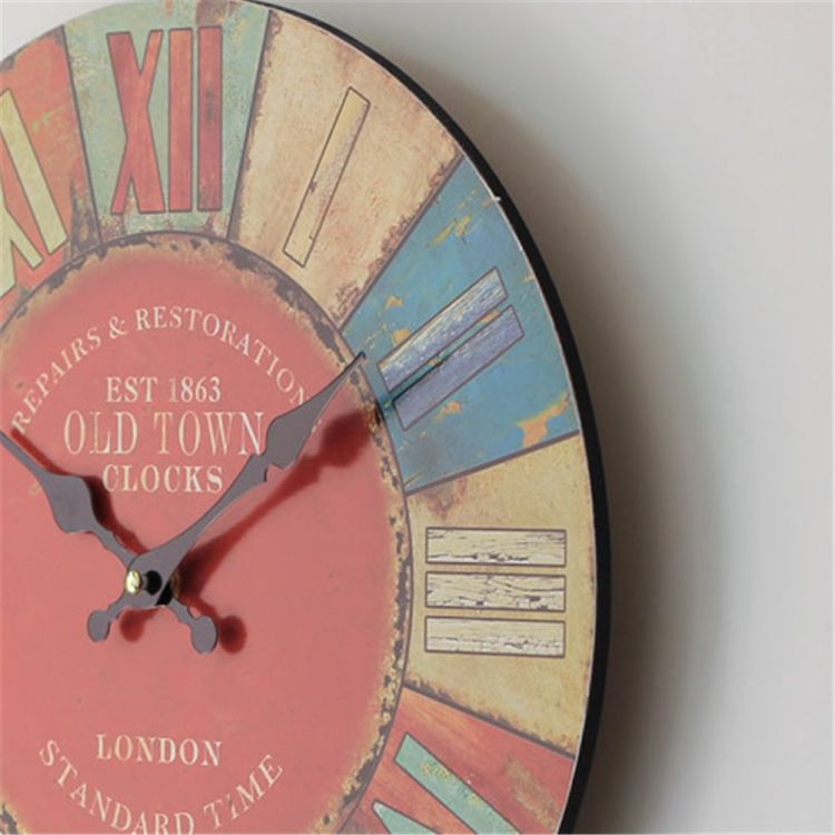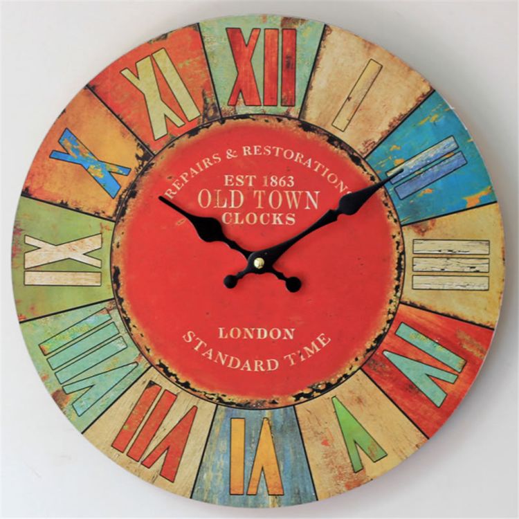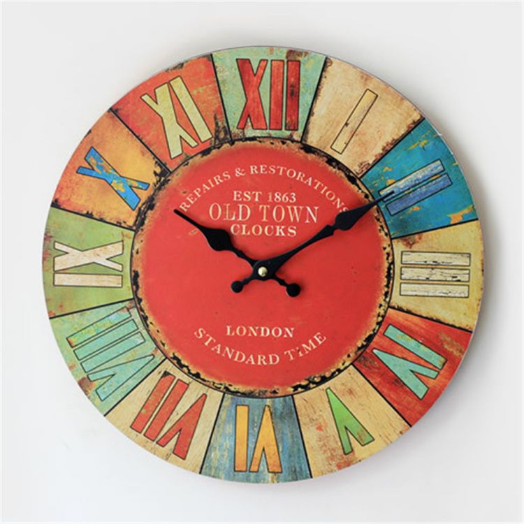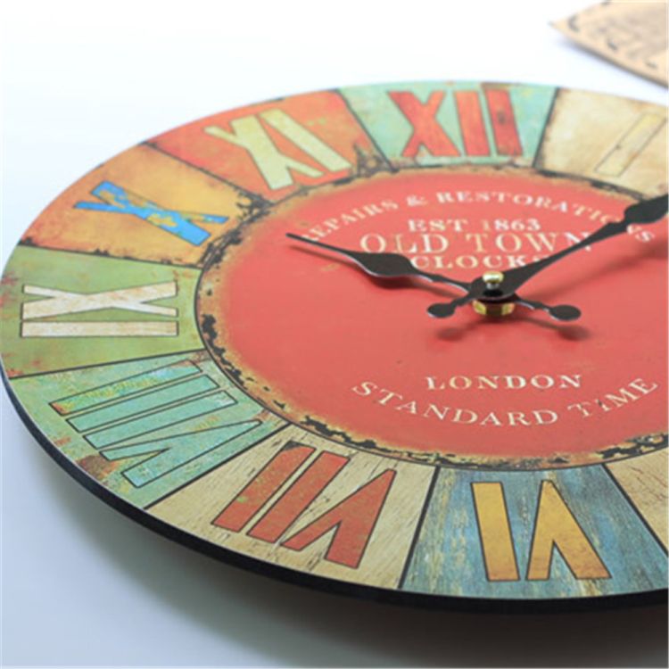 Wall Clock Roman Numeral Retro Vintage Wood Home Decor Colored Drawing