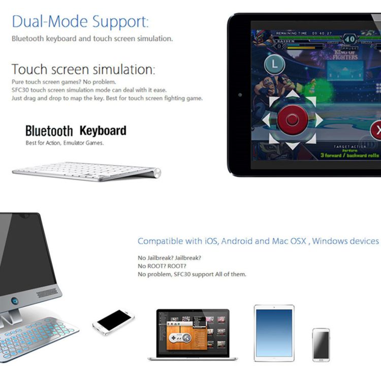 - Dual-mode support: Bluetooth keyboard and touch screen simulation.