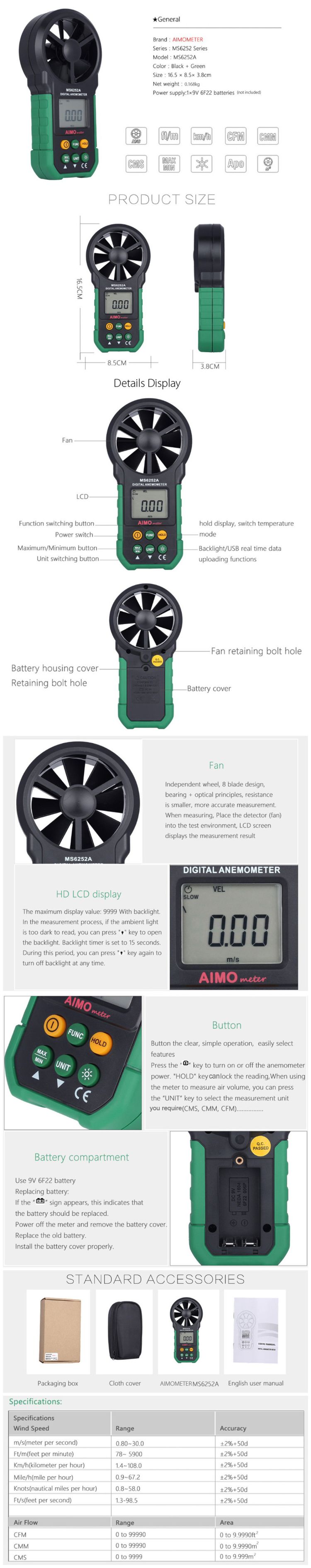 This meter is a digital anemometer for measuring the ambient temperature, humidity, dew point temperature, wet bulb temperature, wind speed and air volume. It is a portable and professional measuring instrument with large-screen LCD backlight and multi-unit switching functions.