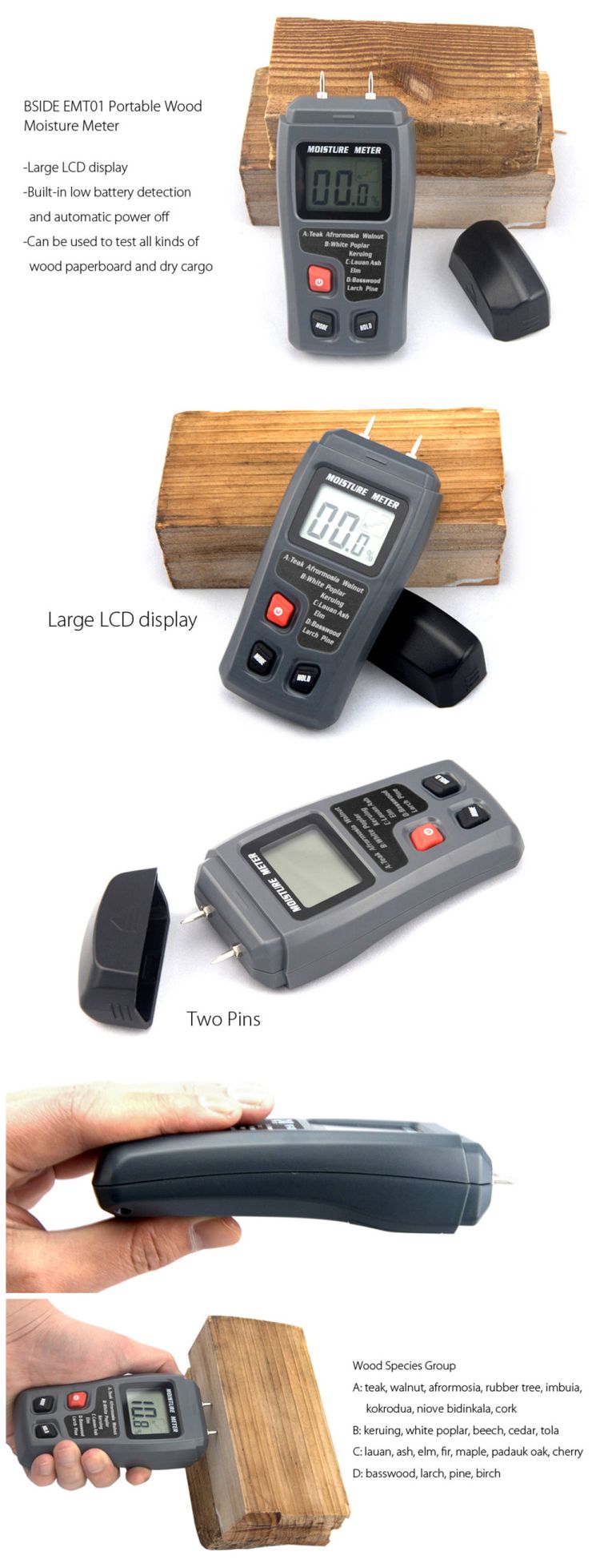 ● Large LCD display of wood moisture value