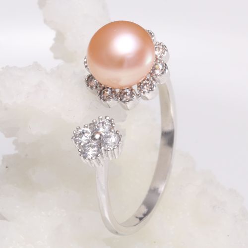 CYNMOON AAAA Quality Freshwater Pearl Ring with Cubic Zircon,Sterling Silver White Pink Pearl Open Ring Party Gift for Women