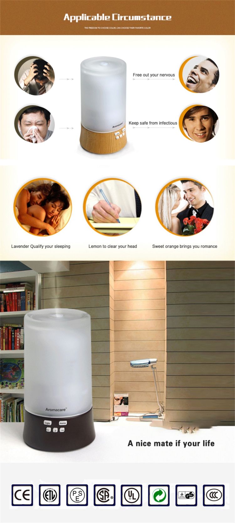 7 COLORS FOR LIGHT CHOICE light powered on the same time with antomization, and 7 colors for choose, and romance comes to you.