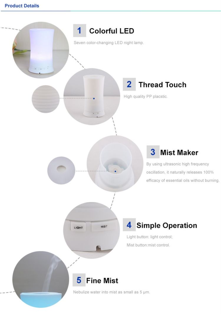Item Tittle-- Ultrasonic Humidifier Mute Aromatherapy Essential Oil Diffuser Atomization Container Home Office with LED Light